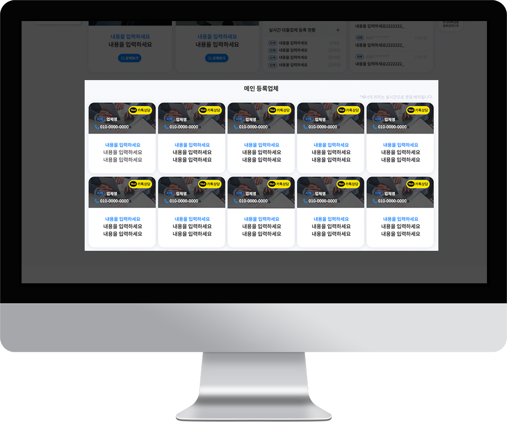 - 홈페이지 첫 화면, 지역별, 대출상품별, 실시간 대출문의 4페이지 노출